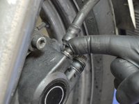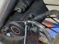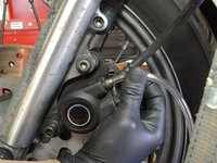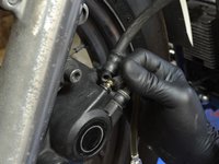 Using a 3/8" wrench with your left hand, open the bleed valve on the front brake cylinder.