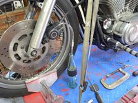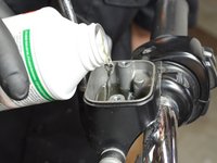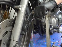 Continue to force more brake fluid out of the brake lines by depressing the front brake lever with your right hand.