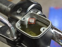 Using a Phillips #2 screwdriver, remove the two screws securing the lid on the master brake fluid cylinder.