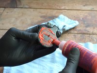 Using a can of brake cleaner, spray out the piston and inside of the brake caliper.