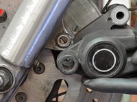 Slide the brake assembly until the lower hole in the brake assembly aligns with the lower mount hole on the fork.
