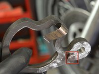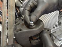 Using a 5/16 wrench, remove the bolt holding the stationary brake pad cover in place.