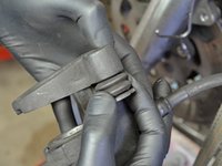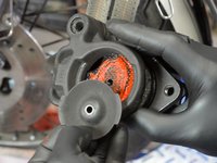 With the piston on the outside of the rotor, carefully slide the front brake assembly back over the rotor