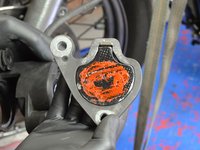 Using one hand to keep the brake pads from falling out, replace the cover on the stationary brake pad.