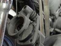 Being careful to not let any loose parts fall out of the brake assembly, remove the stationary brake pad from the front brake assembly.