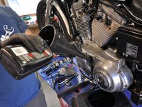 For the best access to the transmission drain plug, optimal draining, and accurate re-filling, we recommend working with the bike secured in an upright position.