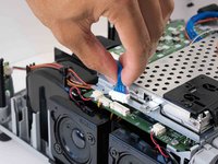 Carefully pinch and remove the small gray connector next to the blue wire opposite the speakers.