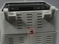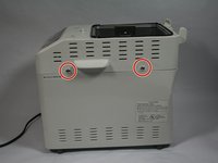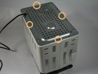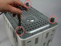 • Flip the machine over so that the bottom is facing straight up. Then unscrew the four feet on the device with a #2 Phillips head screwdriver. The screws will stay in the rubber feet.