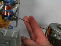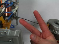 • Locate the capacitor (aka the black box) to the left of the motor). Unscrew the 1cm screw holding the capacitor in place. The screw will stay with the capacitor.