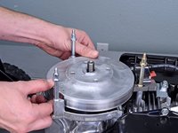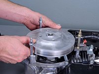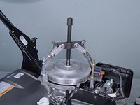 Use a universal puller to loosen the flywheel from the tapered pressure fit on the end of the crankshaft.