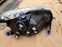 There are 3 screws securing each headlight. The top screw is the easiest to get to and can be removed in plain sight before even taking the front bumper off. The screws on the sides, however, are seen only after the bumper is removed and are still difficult to get to.