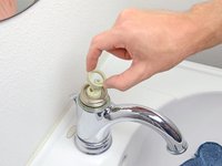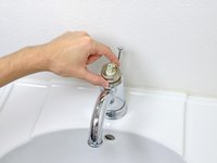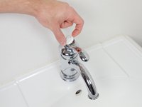 Use your fingers or a prying tool to remove the plug button from the top of the faucet handle.
