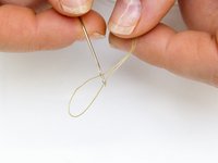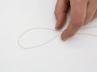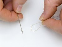 Anchor the thread: starting from the backside of the fabric, poke the needle through the previous needle hole from the original button. Then push the needle back through the fabric, right next to where it came out. Slide the needle through the looped end of the thread and pull taught.