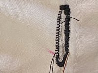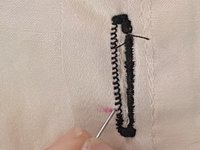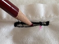 Starting on the right of the existing buttonhole, stitch to your chalk mark or pin, matching the width of the original stitching.