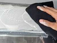 Dip the soft sponge in the soapy water and gently rub the glass until there is no grease or spots.