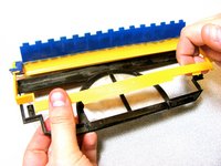 While still pulling the yellow tabs with your index fingers, tilt up the brush guard.