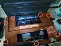 Next, locate the seven torx screws (highlighted in red circles). To avoid confusion when reassembling later, we suggest drawing a picture of the printer and taping the screws to the image.