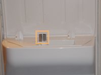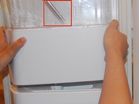 Remove the ice bucket from the freezer by pressing your right thumb on the button to the right and lifting the ice bucket.