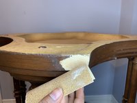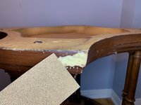 • Using a sheet of 150-grit sandpaper, slightly sand away any wood pieces protruding from the damaged area.