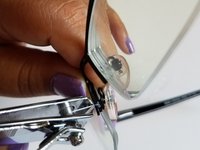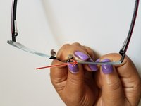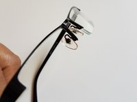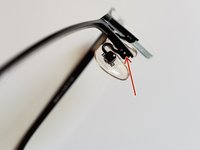 Hold the glasses in the position shown in the image. There will be a hole near the nose pad, shown by the arrow in the second photo, you will use this to insert the new wire.