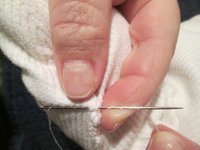 Insert a thread through the eye of the needle (the hole) and tie it tightly to the needle.