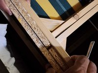 To find the exact problem of making the sofa seat unleveled, use a utility knife to cut a line across the corners of the big sheet covering the wood in the sofa.