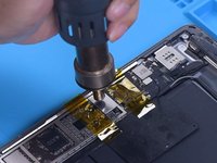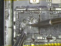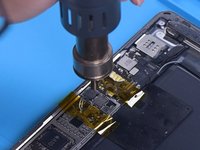 Tear off the tape after grinding. Disconnect the flex cable. To prevent hard desoldering due to fast heat dissipation, pry up the motherboard with a metal blade.