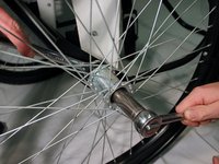 Unscrew the axle bolt Using the Free Wheelchair Mission Custom Multi-Purpose Tool on the bolt head and a 19mm crescent wrench on the nut.