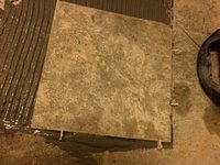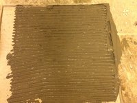 After the mortar is placed on the flooring, use the notched side of the trowel to apply the mortar to the flooring in it's final form. (Even rows visible in mortar.)