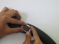 Finally, peel off the back of the patch, place it over the area of rubber cement with the hole centered, and then apply pressure with thumb until rubber cement is dry.