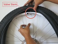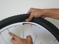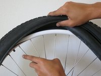 Starting by placing the valve stem into the hole in the rim, begin pushing the tube into and under the tire. Then continue all the way around the tire.