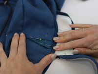 Once you have stitched the first side of the patch. Apply more sewing pins to set the patch in place and continue sewing.