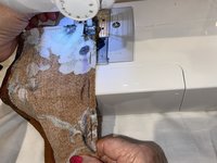 Use the sewing machine to sew the fabric to the pants, using the stitches as your guide.