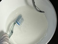 Take a toothbrush and dip it in the mixture of vinegar and baking soda.