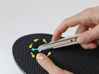Use a circular cutting motion to slice the knife blade through the foam, using the hole as the central location. (yellow arrows)