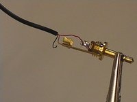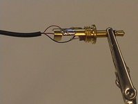 Put the exposed cord through the metal and plastic sleeves of the jack, as shown.