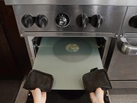 Using oven mitts, pull the glass and record assembly out of the oven.