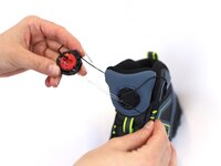 Hold the dial with both hands and push it against the "tongue" of the boot until you hear a "click" sound.