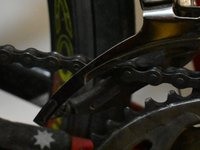 The front derailleur is the mechanism that shifts the chain on a bike with more than one front chain-ring. Its function is to move the chain from side to side between the front chain rings to shift gears; however, it has to do this with the top, taut portion of the chain. There are many different makes and models, but they all share the same basic design and functionality. Front derailleurs are attached to the bike with either a clamp or bracket. You need the correct "clamp size" (the clamp is the ring that anchors the derailleur to the bottom of your seat tube). Clamps come in 1-1/8", 1-1/4", and 1-3/8". Most bikes will use the 1-1/4" size.