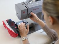In our example, the original speedlace was connected at the ends with a fabric pulling patch. We will re-attach it in now, using the sewing machine.