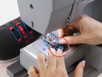 Wrap the patch around the lace endings and place it onto the sewing machine. The open side (red circle) should point towards you.