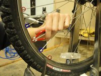 Fit the wheel into the wheel truing stand. It doesn't matter which way the wheel is facing.