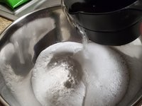 Pour vinegar into the bowl with the baking soda.