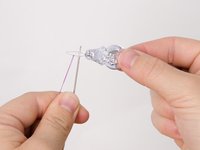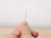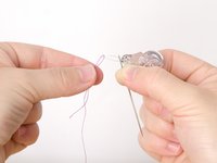 While holding both threads, pull the wire loop of the needle threader out of the eye of the needle.