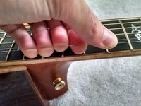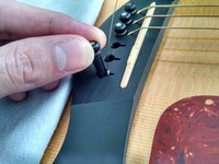 • Starting with the smallest string (high E), take the ball end and thread it into the first bridge pin hole. Take a bridge pin (the pins are uniform so it doesn't matter which) and, pointing the small cutout toward the string, push it back into the hole with the string. As you push the pin down, pull the string up until it is snug.