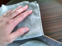 • When the entire bottom half of the instrument has been coated, flip the cloth over to a dry, clean side and repeat the same process in reverse - a counterclockwise circular rubbing motion over the length of the bottom front half of the guitar. Wax on, wax off!