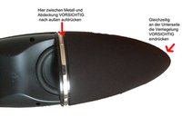 Use a flat plastic tool or a blunt knife in the slot between the chrome bar and speaker cover to push the grille outward, while at the same time pressing the plastic fastener on the back side at the edge. USE CAUTION, the clips can break easily. Then slide the cover slowly to the side.