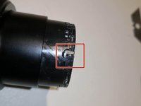 Note that the long plastic tip on the cover should fit in the whole marked orange when reassembling the lens.