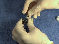 Take the bearing out of the gasoline and remove one side of the outside plastic locks by applying pressure on the inner ring and prying up.
