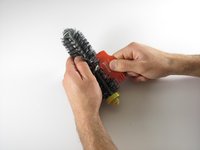 Push down on the two yellow tabs, and pull open the brush gate gently
